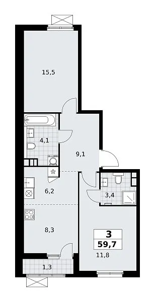 Количество комнат: 3, 59.7 кв.м.