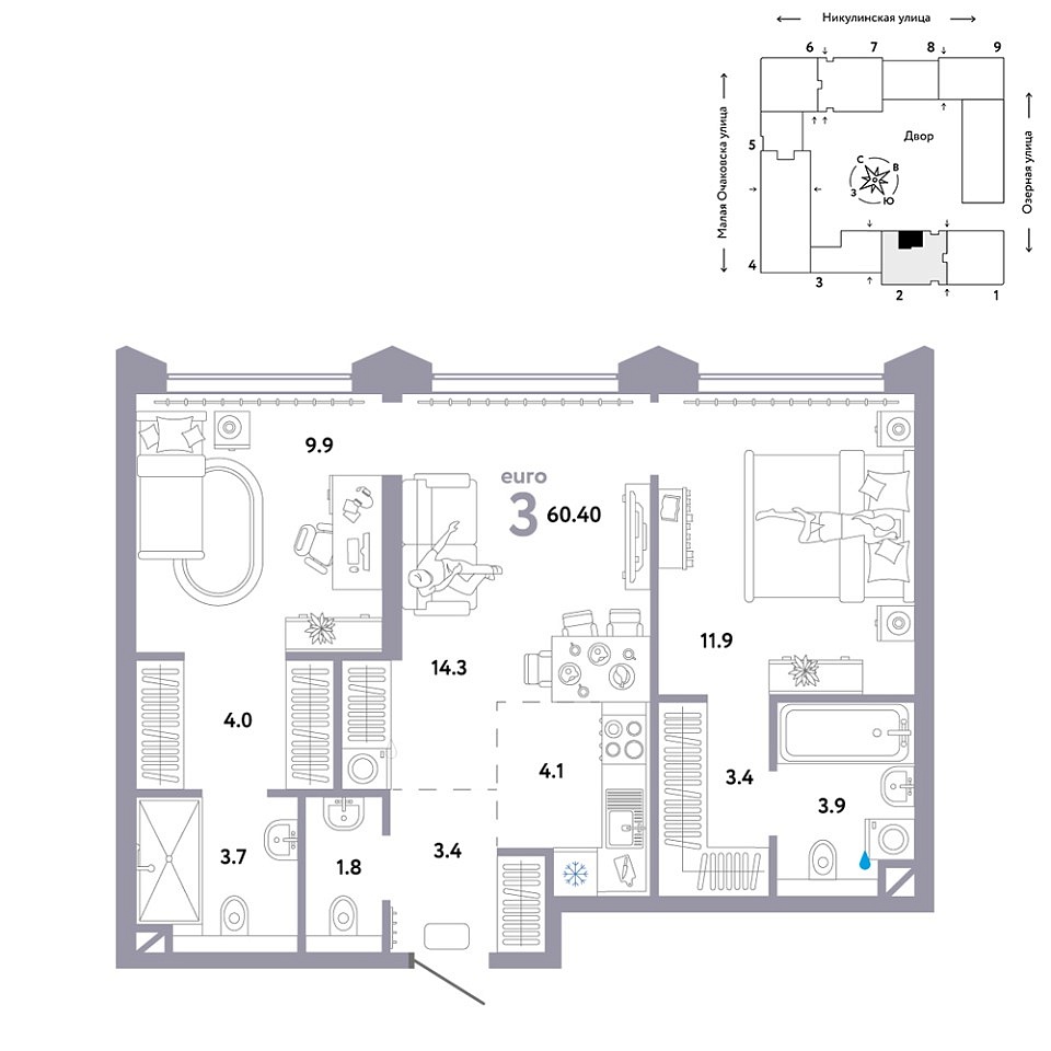 Площадь (общ/жил/кух), м2: 63.6/40.2/—