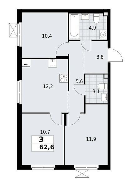 Количество комнат: 3, 62.6 кв.м.