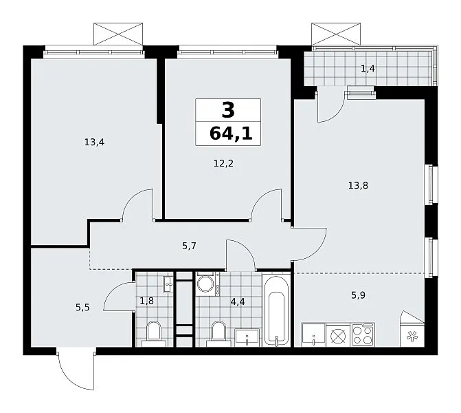 Количество комнат: 3, 64.1 кв.м.