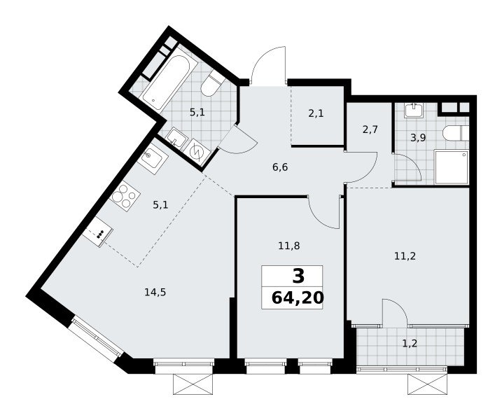 Площадь (общ/жил/кух), м2: 64.3/—/5.1