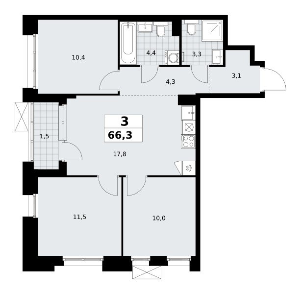 Количество комнат: 3, 66.3 кв.м.