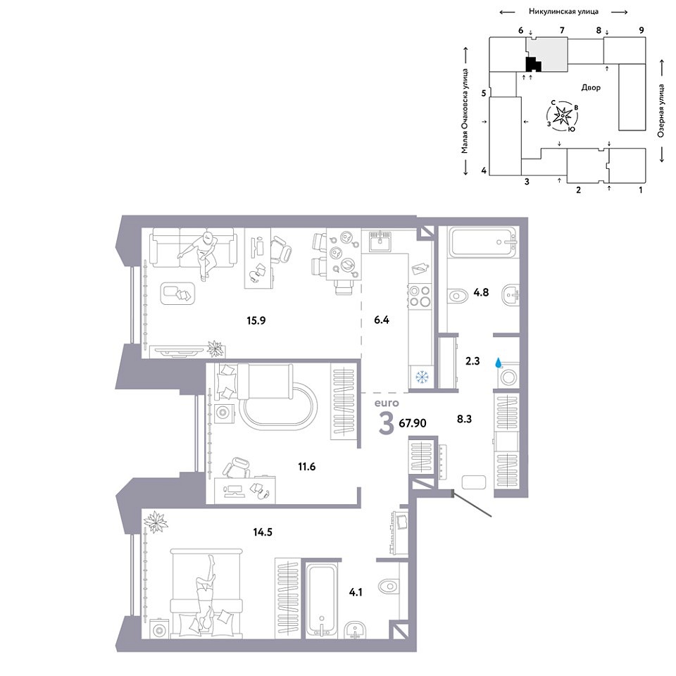 Количество комнат: 3, 67.9 кв.м.