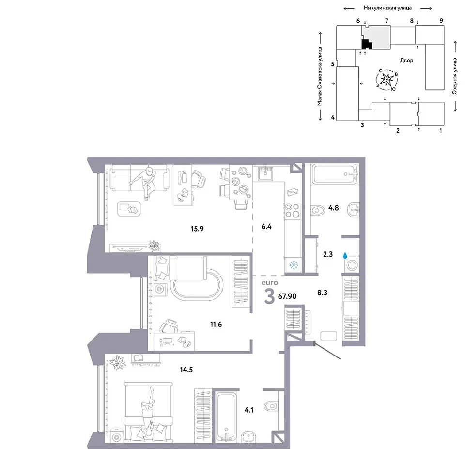 Площадь (общ/жил/кух), м2: 68.9/43.5/—