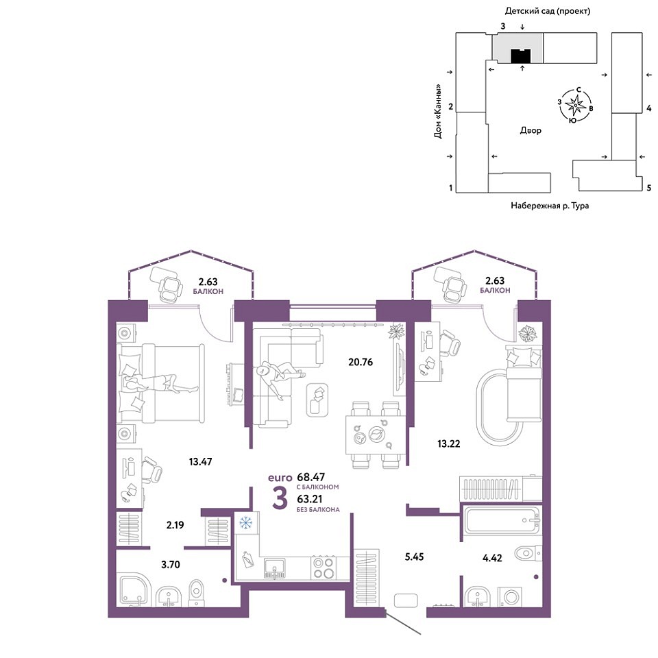 Купить новую трехкомнатную квартиру 68.47 м² на 2/25 этаже в ЖК «Европейский берег 2.0», г. Тюмень за 13048780 ₽ | Агентство недвижимости «Вплюсе.Топ» — Недвижимость России