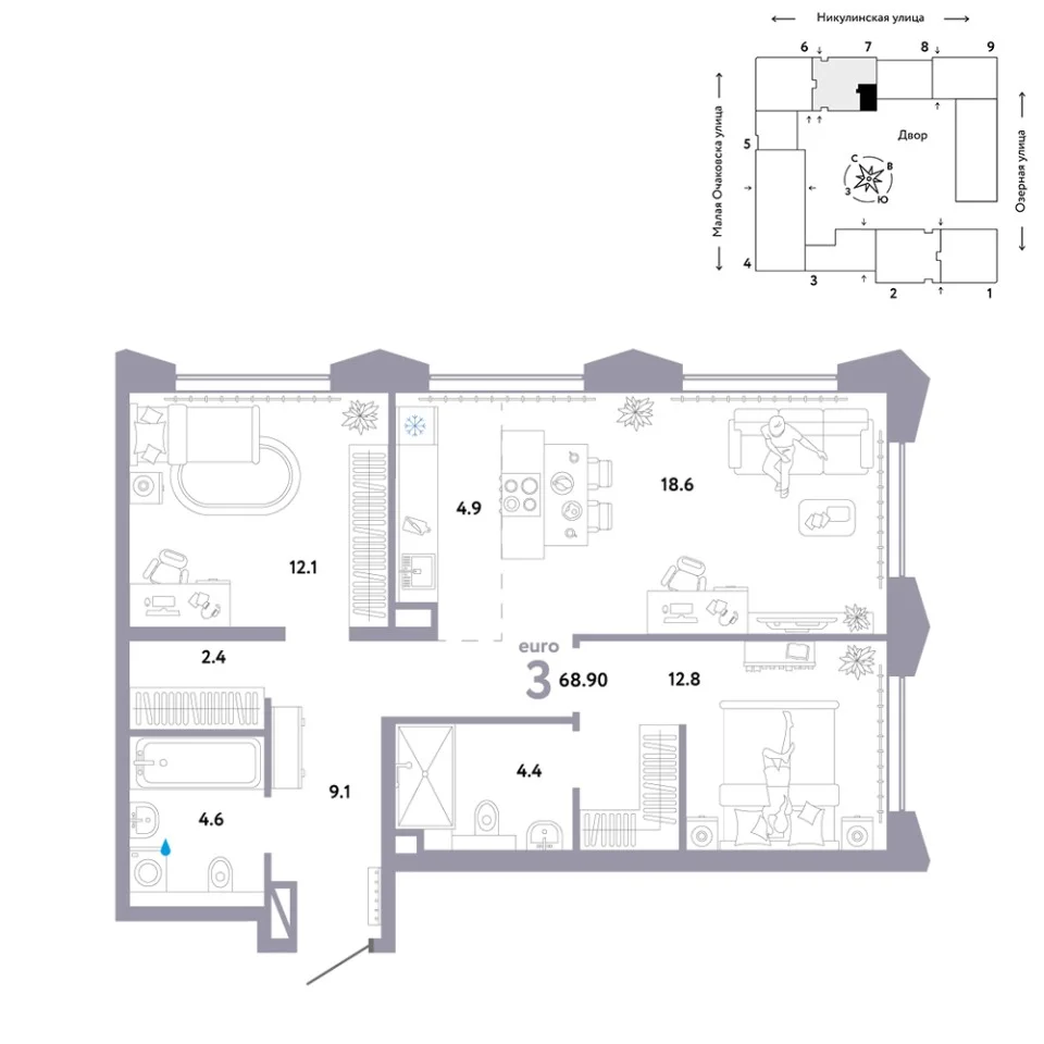 Площадь (общ/жил/кух), м2: 68.9/43.5/—
