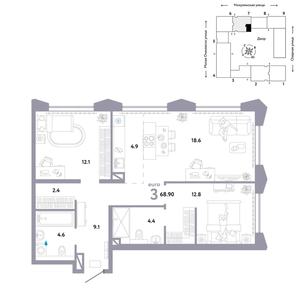 Площадь (общ/жил/кух), м2: 68.9/43.5/—