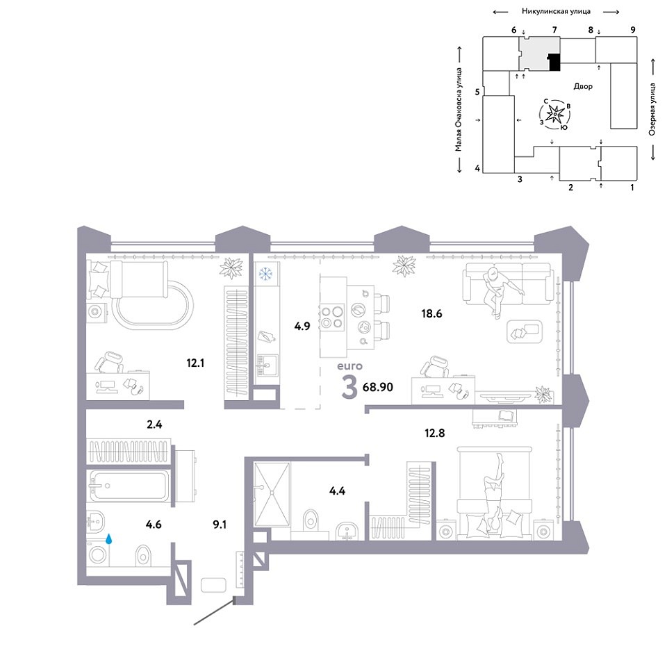 Площадь (общ/жил/кух), м2: 68.9/43.5/—