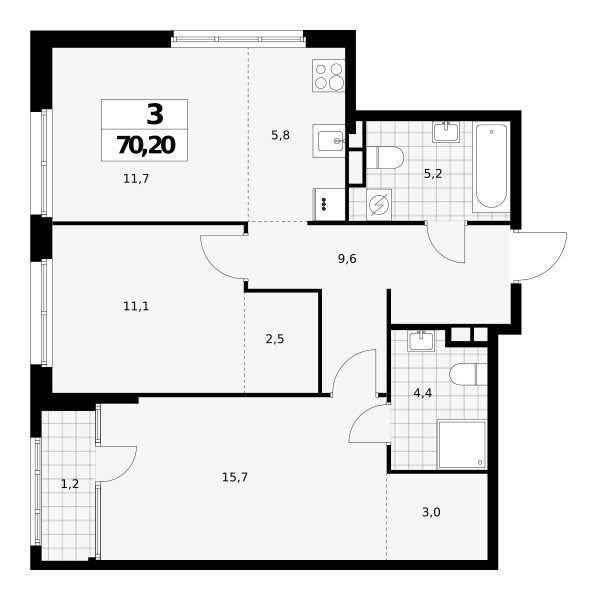 Количество комнат: 3, 70.2 кв.м.