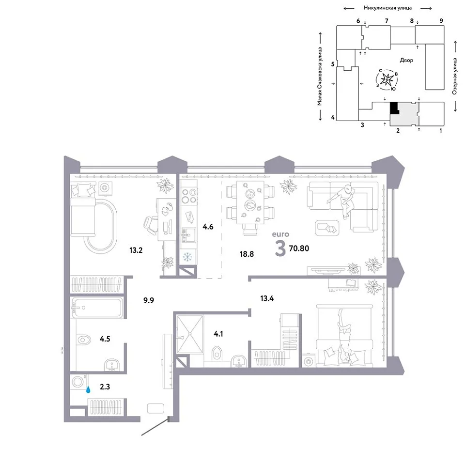 Количество комнат: 3, 70.8 кв.м.