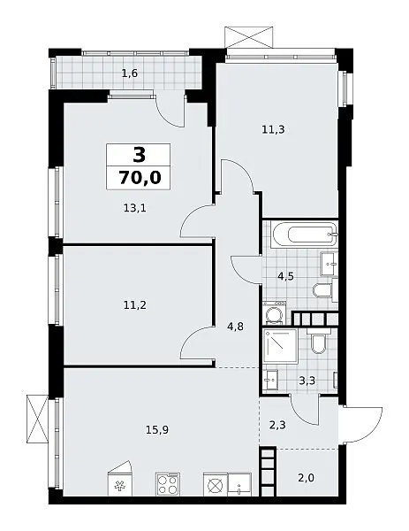 Площадь (общ/жил/кух), м2: 70/—/15.9