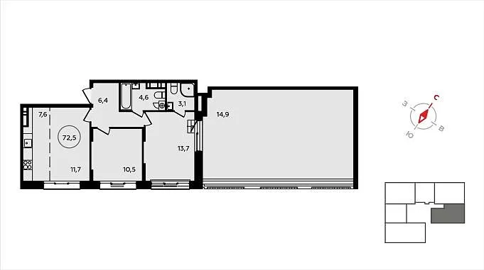 Количество комнат: 3, 73.6 кв.м.