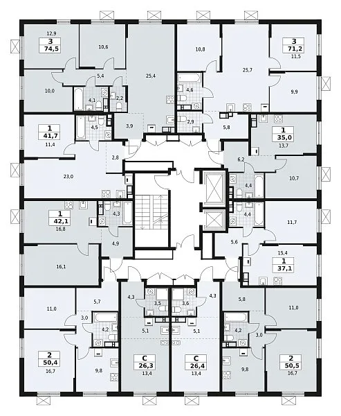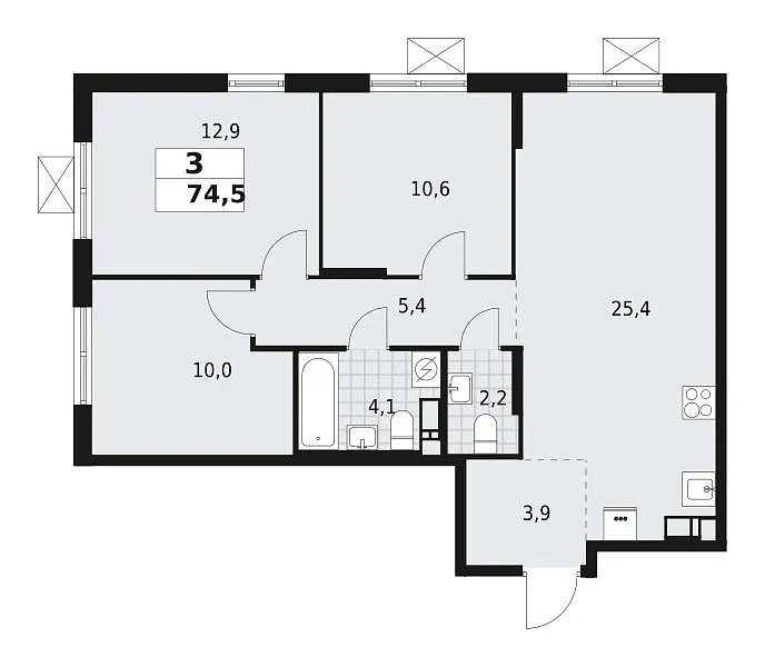 Площадь (общ/жил/кух), м2: 74.6/—/25.5