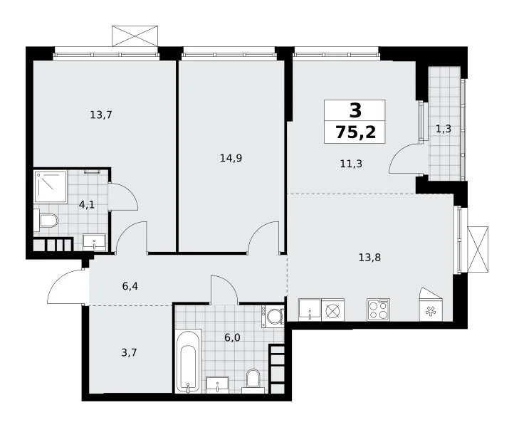 Площадь (общ/жил/кух), м2: 75.3/—/13.8