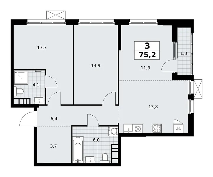 Площадь (общ/жил/кух), м2: 75.3/—/13.8