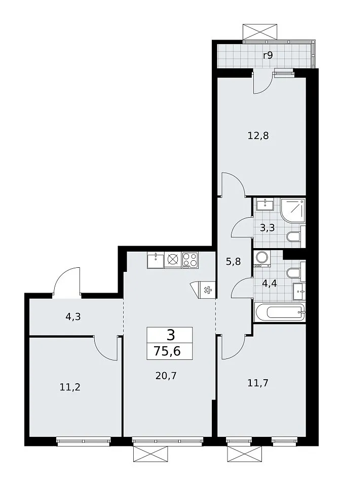 Количество комнат: 3, 75.6 кв.м.