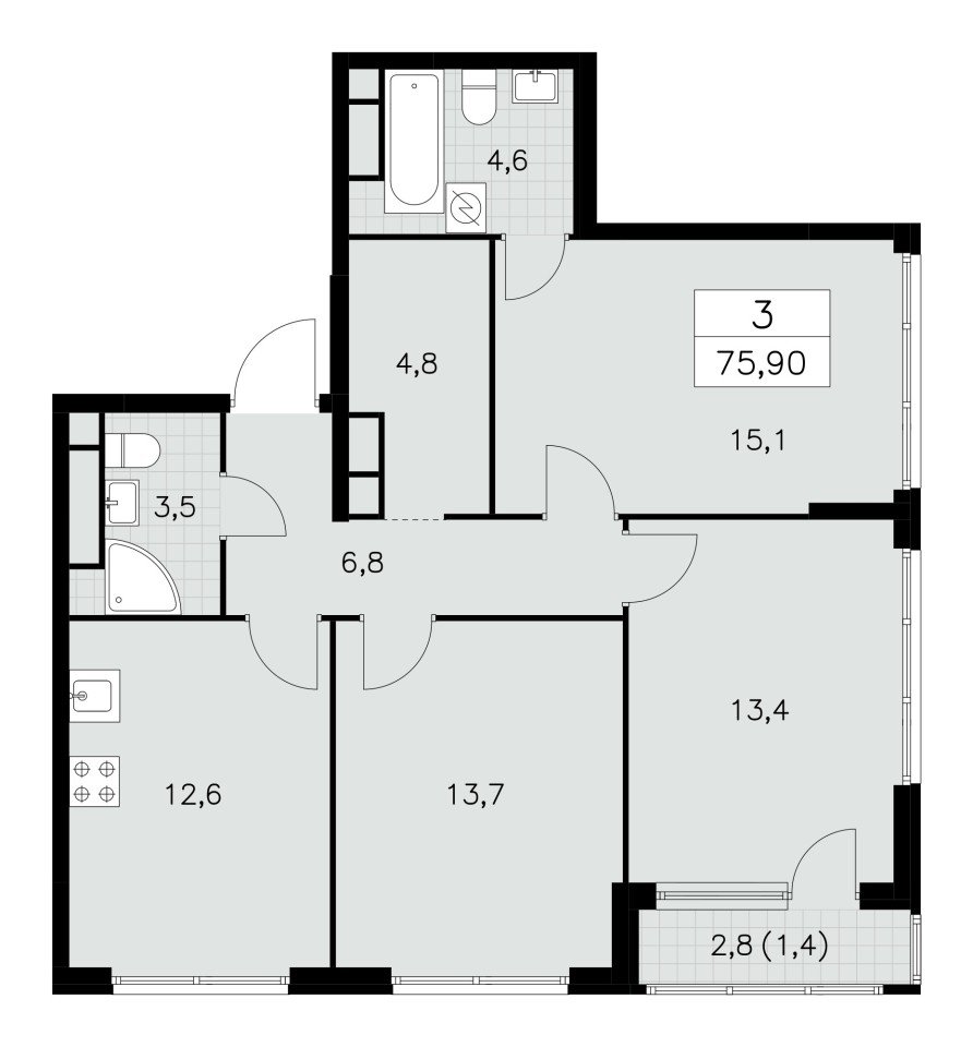 Площадь (общ/жил/кух), м2: 75.2/—/13.8
