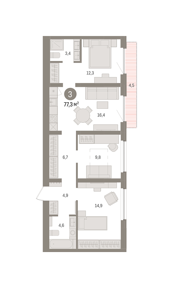 Количество комнат: 3, 77.34 кв.м.