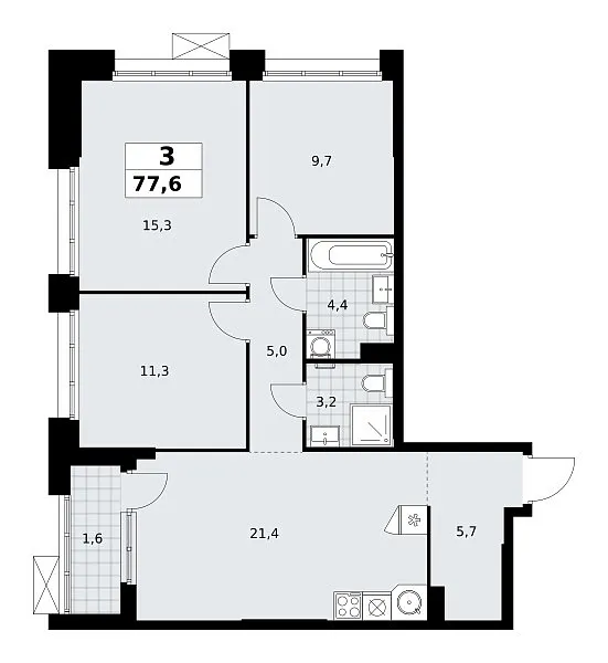 Количество комнат: 3, 77.6 кв.м.