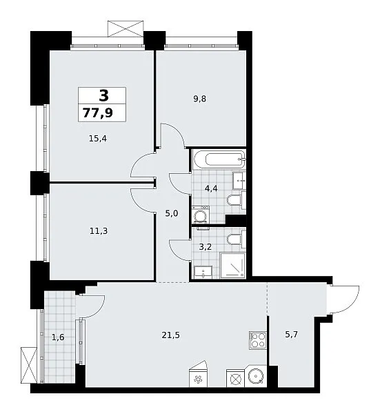 Количество комнат: 3, 77.9 кв.м.