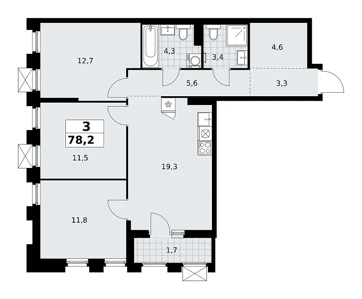 Количество комнат: 3, 78.2 кв.м.
