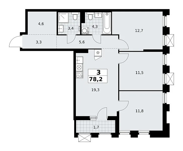 Количество комнат: 3, 78.2 кв.м.