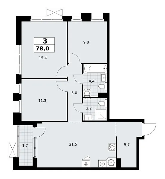 Количество комнат: 3, 78 кв.м.