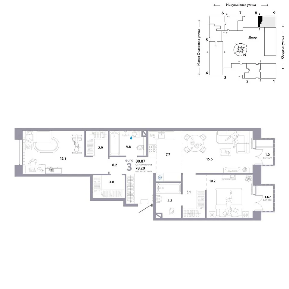 Количество комнат: 3, 80.87 кв.м.