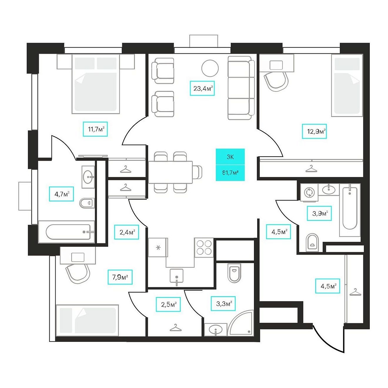 Количество комнат: 3, 81.7 кв.м.