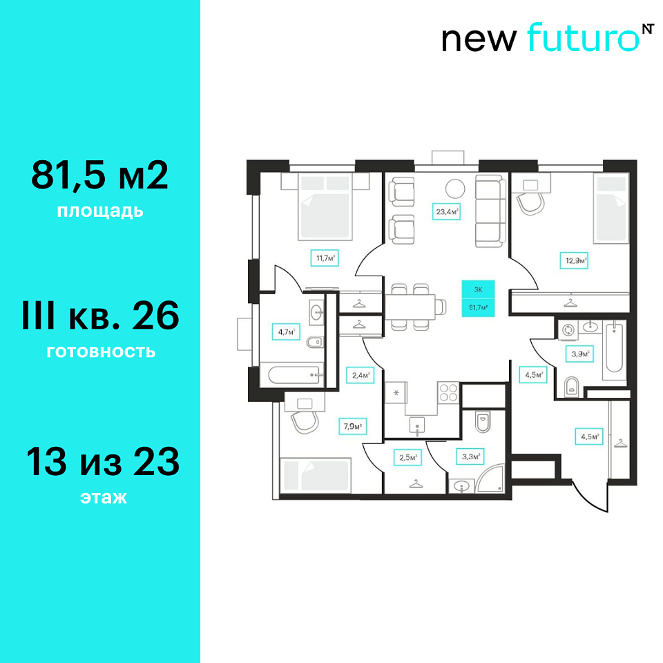 Купить новую трехкомнатную квартиру 81.7 м² на 13/23 этаже в ЖК «Futuro», г. Тюмень за 12430000 ₽ | Агентство недвижимости «Вплюсе.Топ» — Недвижимость России