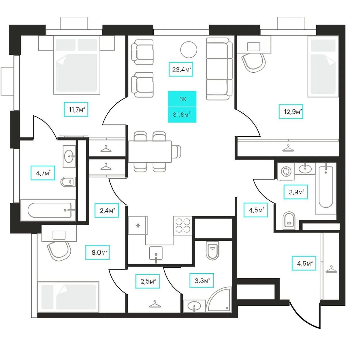 Количество комнат: 3, 81.8 кв.м.