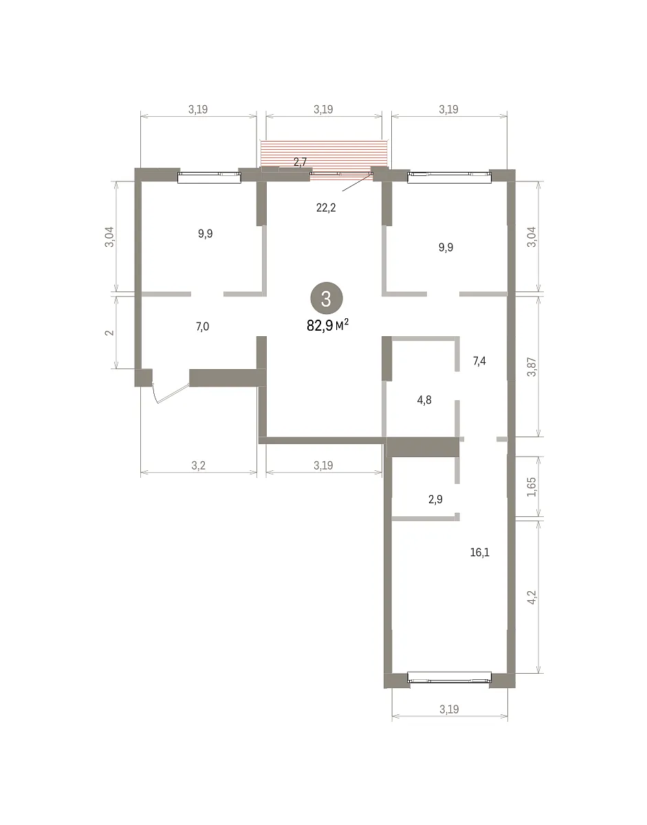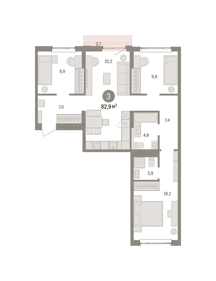 Количество комнат: 3, 82.9 кв.м.