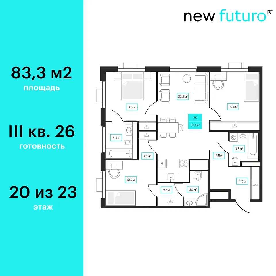 Купить новую трехкомнатную квартиру 83.3 м² на 20/23 этаже в ЖК «Futuro», г. Тюмень за 11120000 ₽ | Агентство недвижимости «Вплюсе.Топ» — Недвижимость России