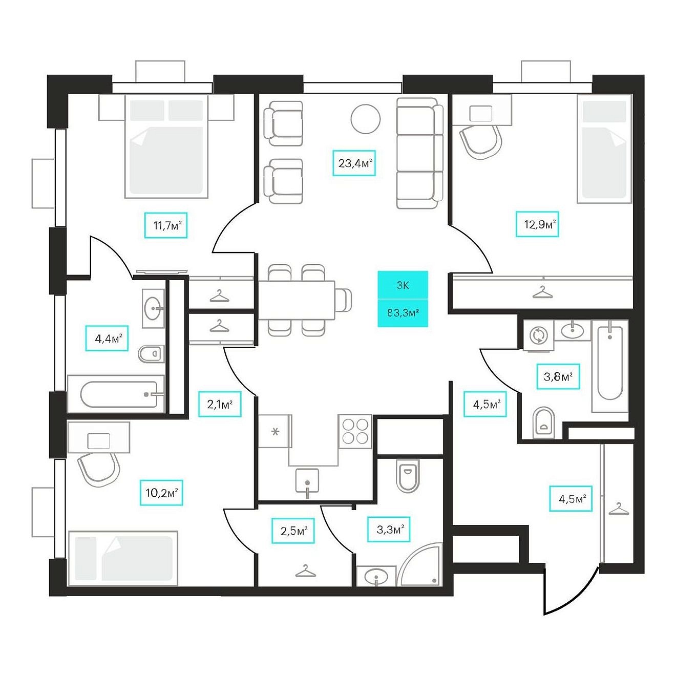Количество комнат: 3, 83.3 кв.м.