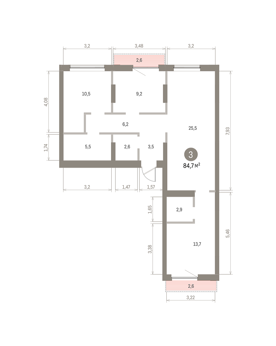 Площадь (общ/жил/кух), м2: 87.54/49.46/10.75