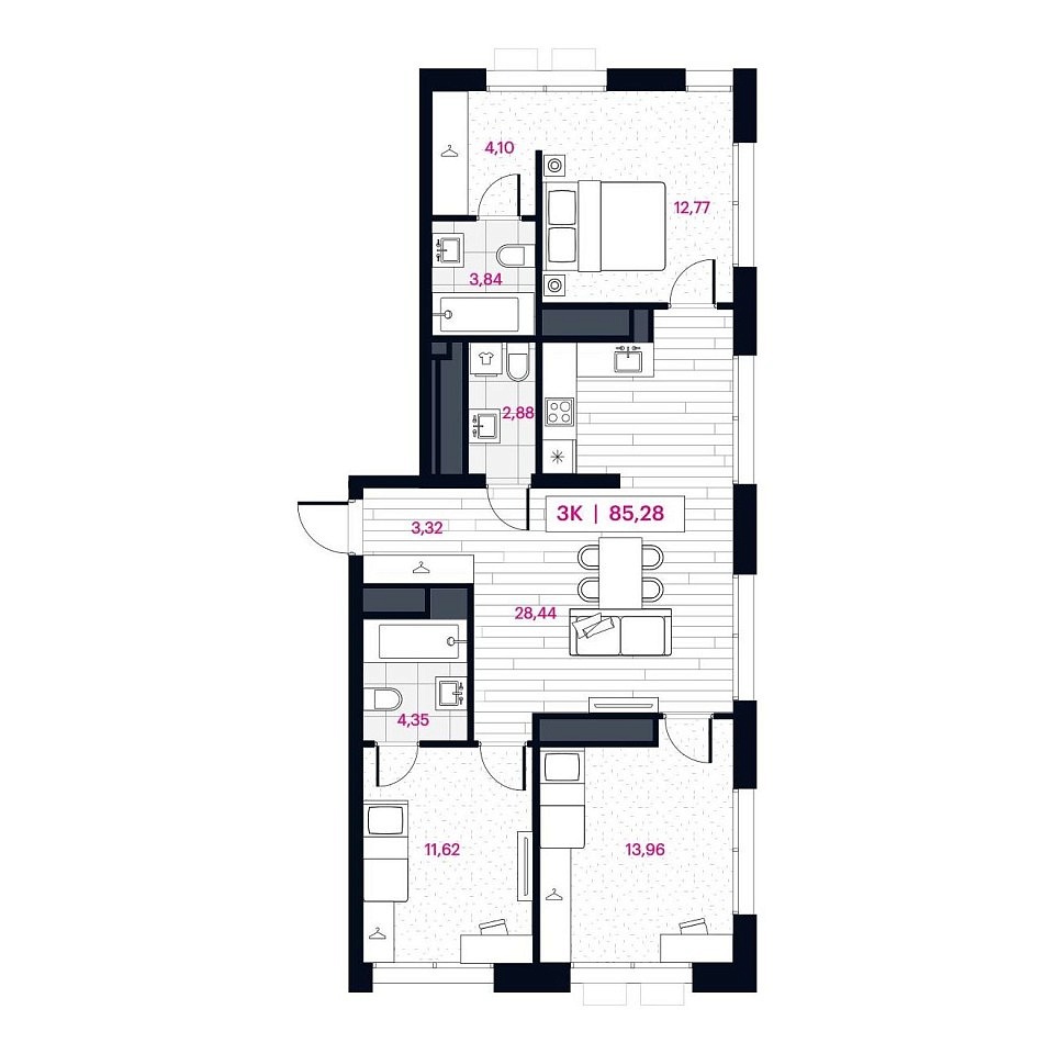 Количество комнат: 3, 85.38 кв.м.