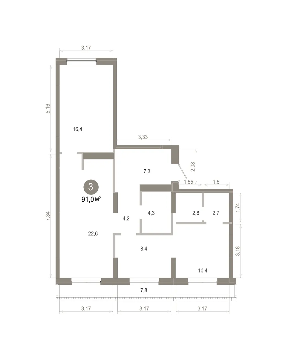 Количество комнат: 3, 86.82 кв.м.