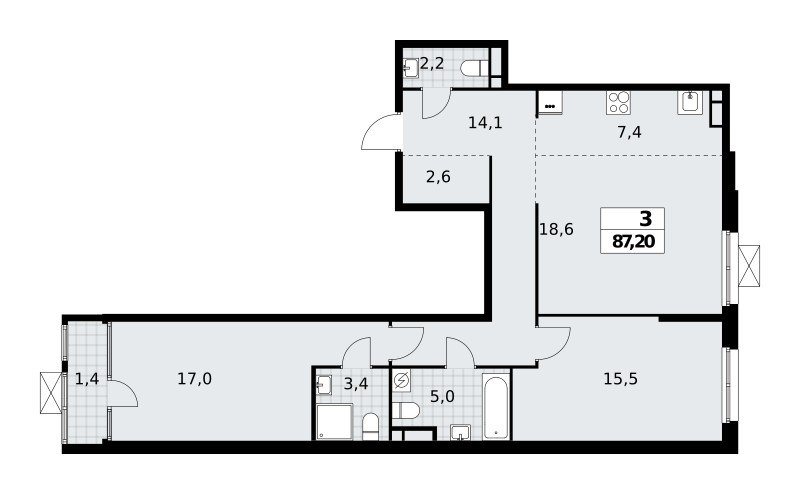 Площадь (общ/жил/кух), м2: 87.2/—/7.4