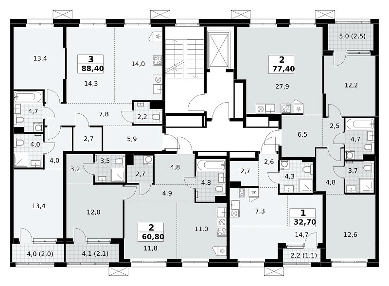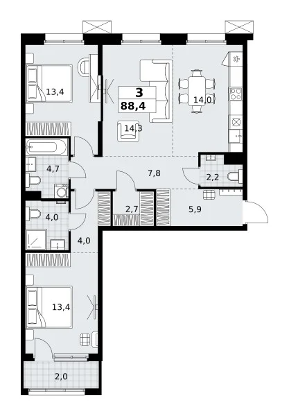 Площадь (общ/жил/кух), м2: 88.4/—/14