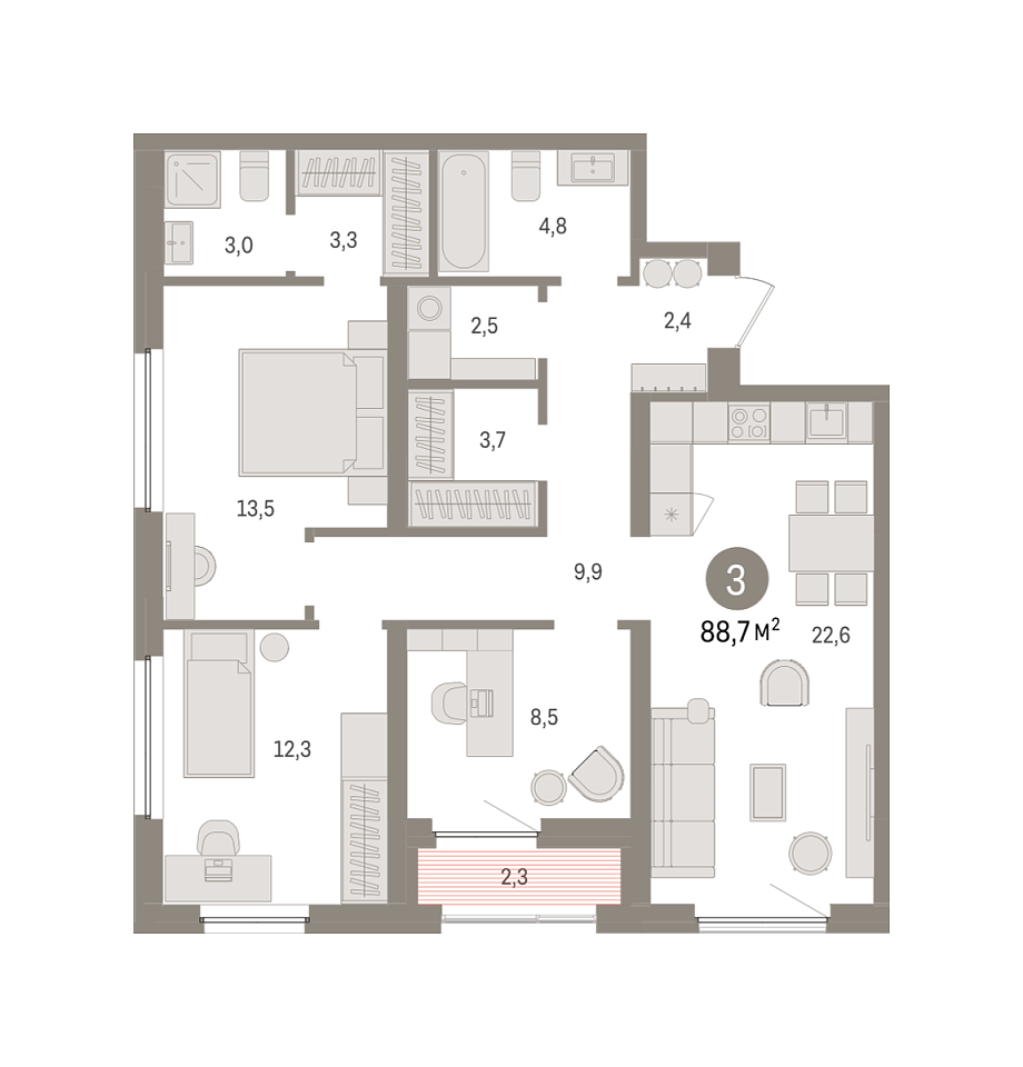 Количество комнат: 3, 88.69 кв.м.