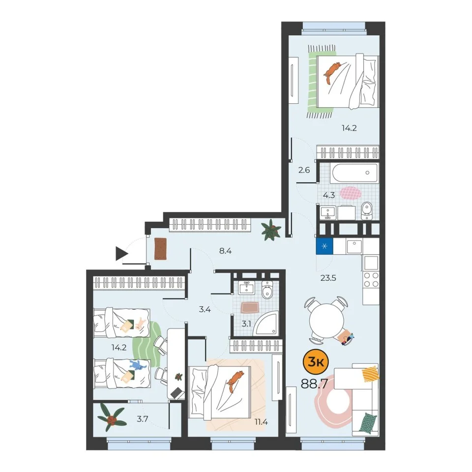 Купить новую трехкомнатную квартиру 88.7 м² на 10/14 этаже в ЖК «Корней», г. Тюмень за 11102207 ₽ | Агентство недвижимости «Вплюсе.Топ» — Недвижимость России