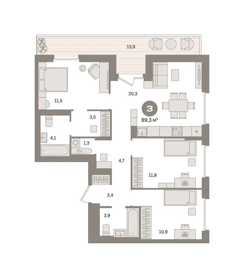 Количество комнат: 3, 89.33 кв.м.