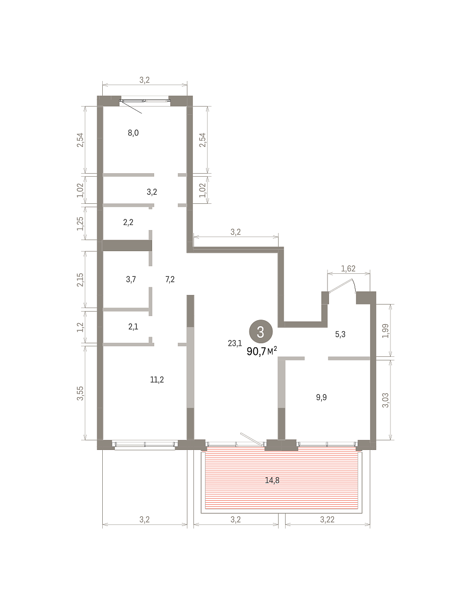 Площадь (общ/жил/кух), м2: 93.4/30.9/22.7