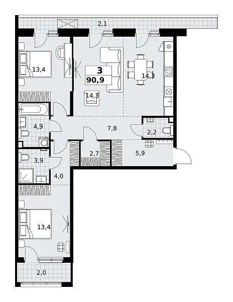 Количество комнат: 3, 90.9 кв.м.