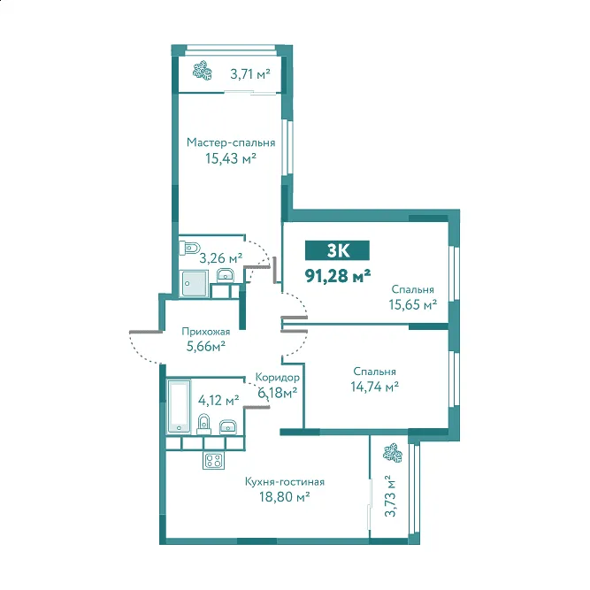 Количество комнат: 3, 91.28 кв.м.
