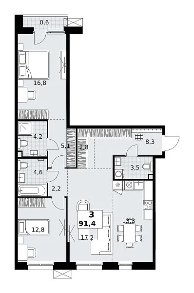 Количество комнат: 3, 91.4 кв.м.