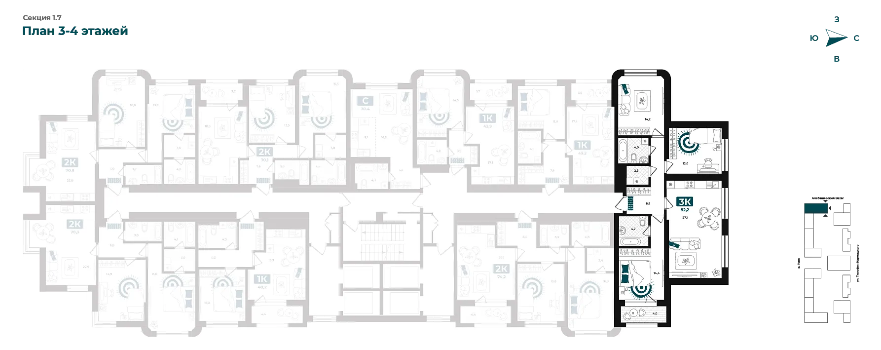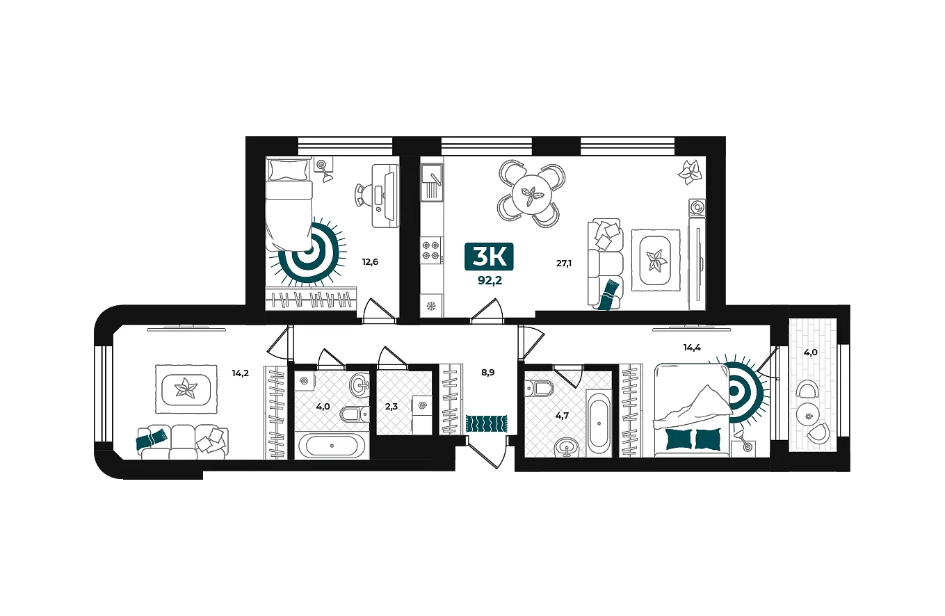 Количество комнат: 3, 92.2 кв.м.