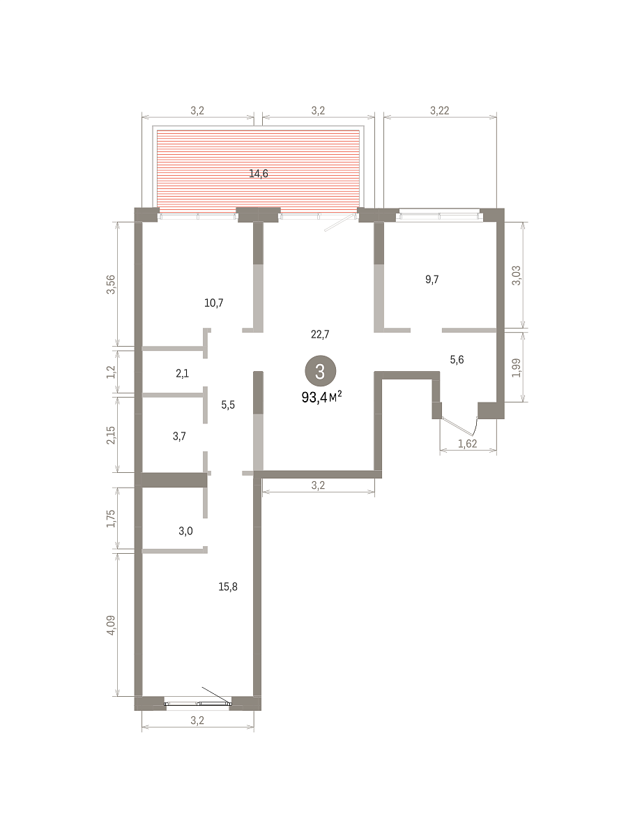 Площадь (общ/жил/кух), м2: 90.7/29.1/23.1