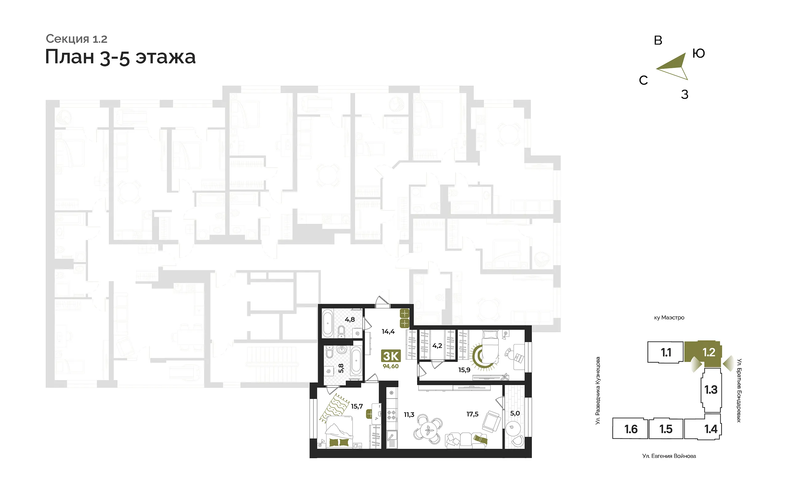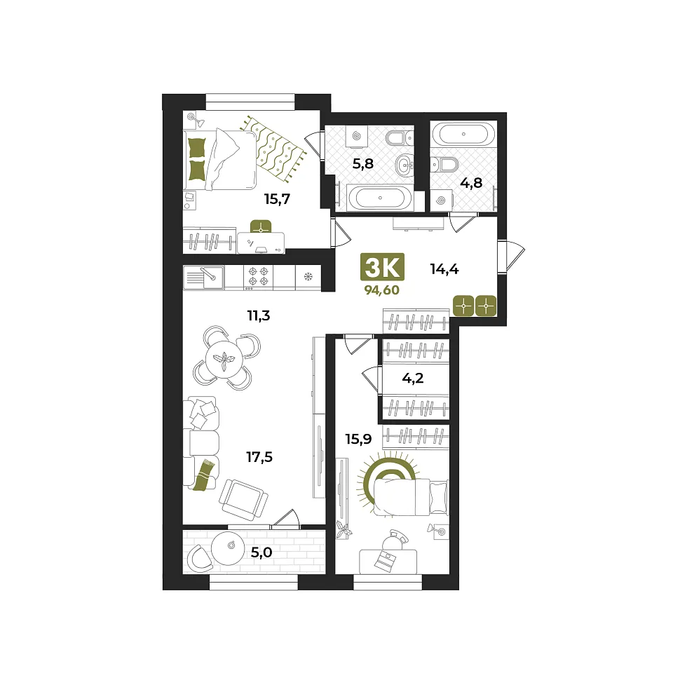 Площадь (общ/жил/кух), м2: 94.2/53.2/21.09