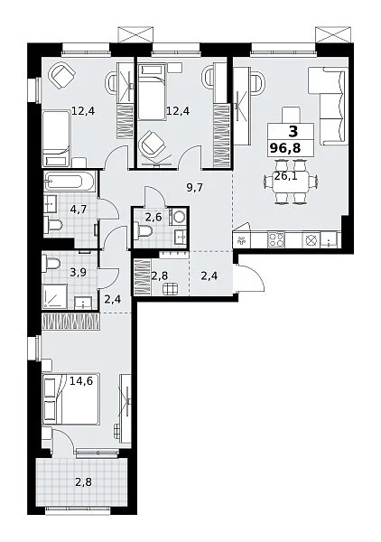 Площадь (общ/жил/кух), м2: 96.8/—/26.2